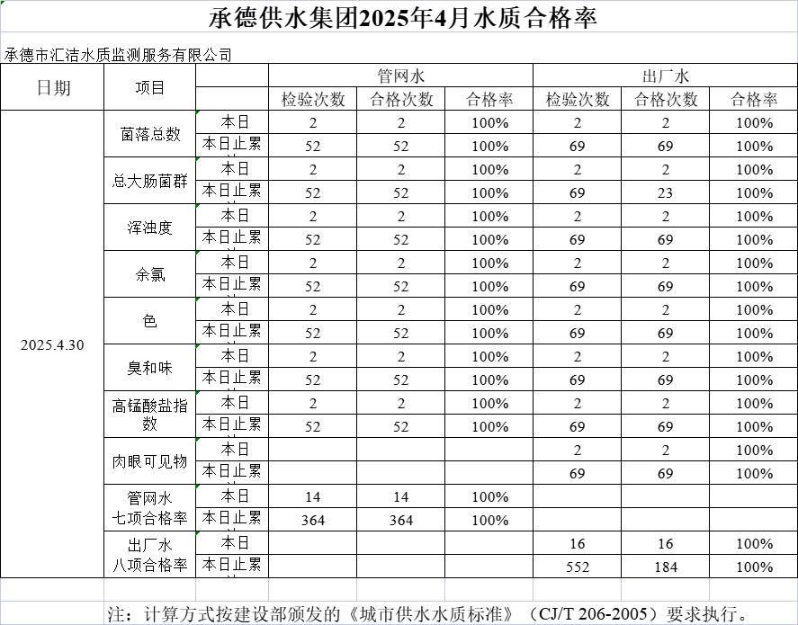 承德供水集團2025年4月30日水質(zhì)合格率