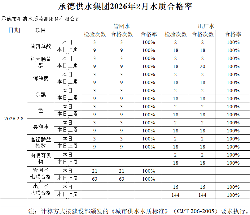 承德供水集團(tuán)2026年2月8日水質(zhì)合格率